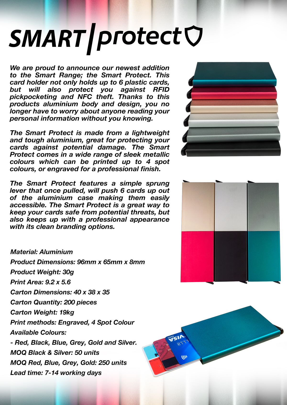The Smart Protect is made from a lightweight and tough aluminium, great for protecting your cards against potential damage. The Smart Protect comes in a wide range of sleek metallic colours which can be printed up to 4 spot colours, or engraved for a professional finish.