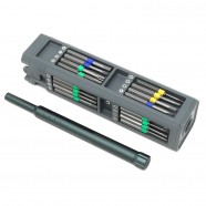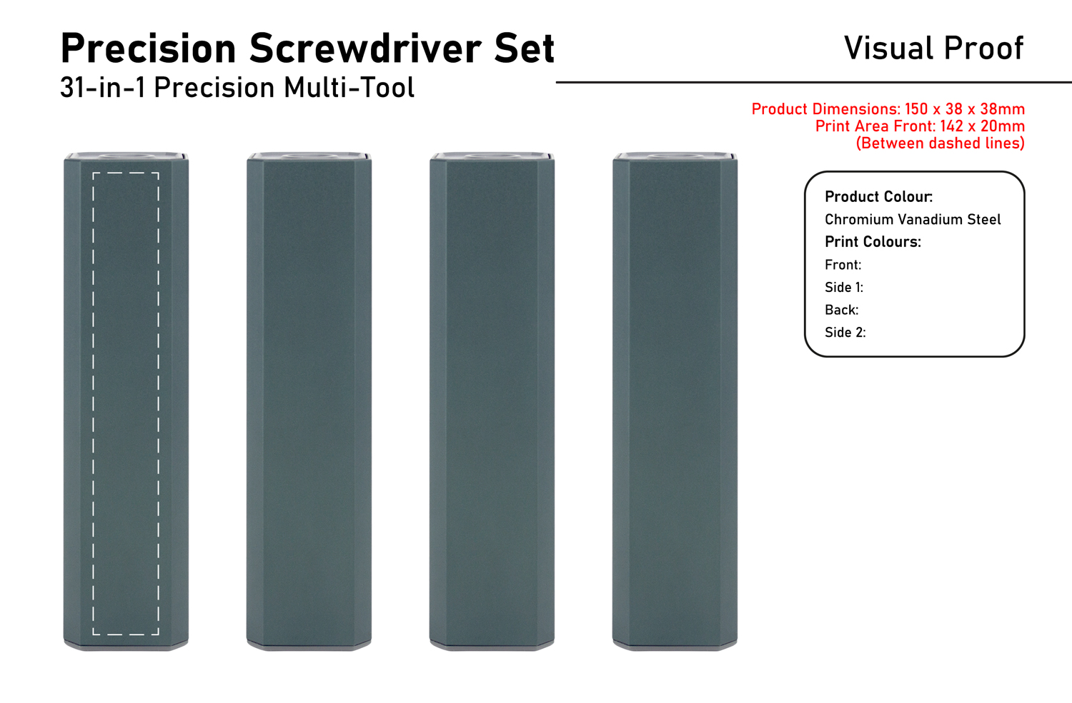 The included bits cover over 28 screw types and are stamped on the side and include plastic colour bands for easy identification. For branding, there are 4 huge print or engraving areas, that can be used to make an eye catching unique promotional product. Tip: to remove the driver, push the two arrow tabs and the driver will pop up.