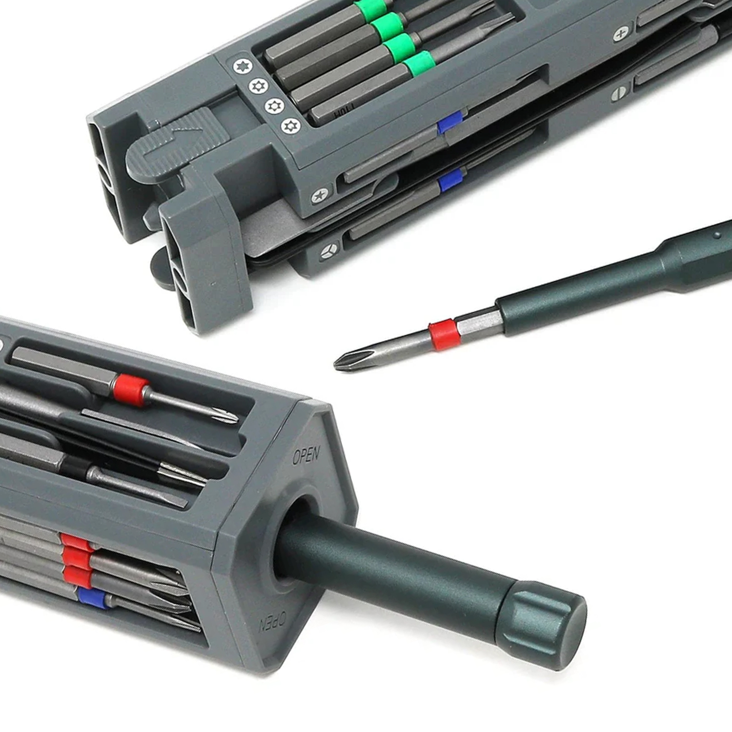The 31-in-1 precision screwdriver set features a push-to-eject metal case, revealing an array of precision bits, tweezers, metal spudger and a slim precision driver with a magnetic tip holder and spinning base. This incredibly useful screwdriver set is the perfect gift for any handyman and will cover any task you have to take on.