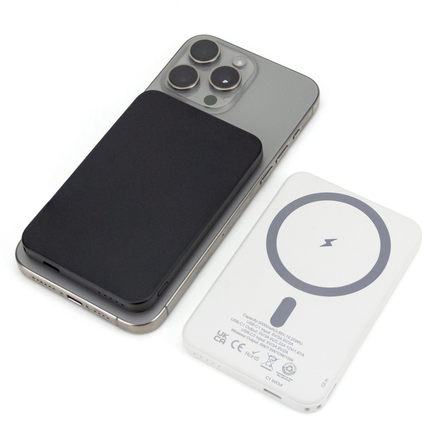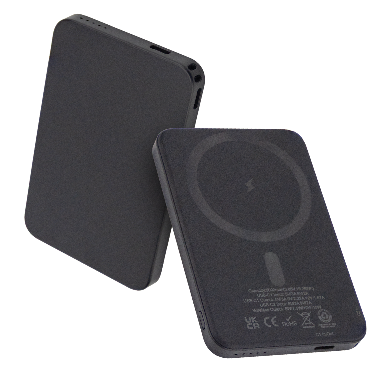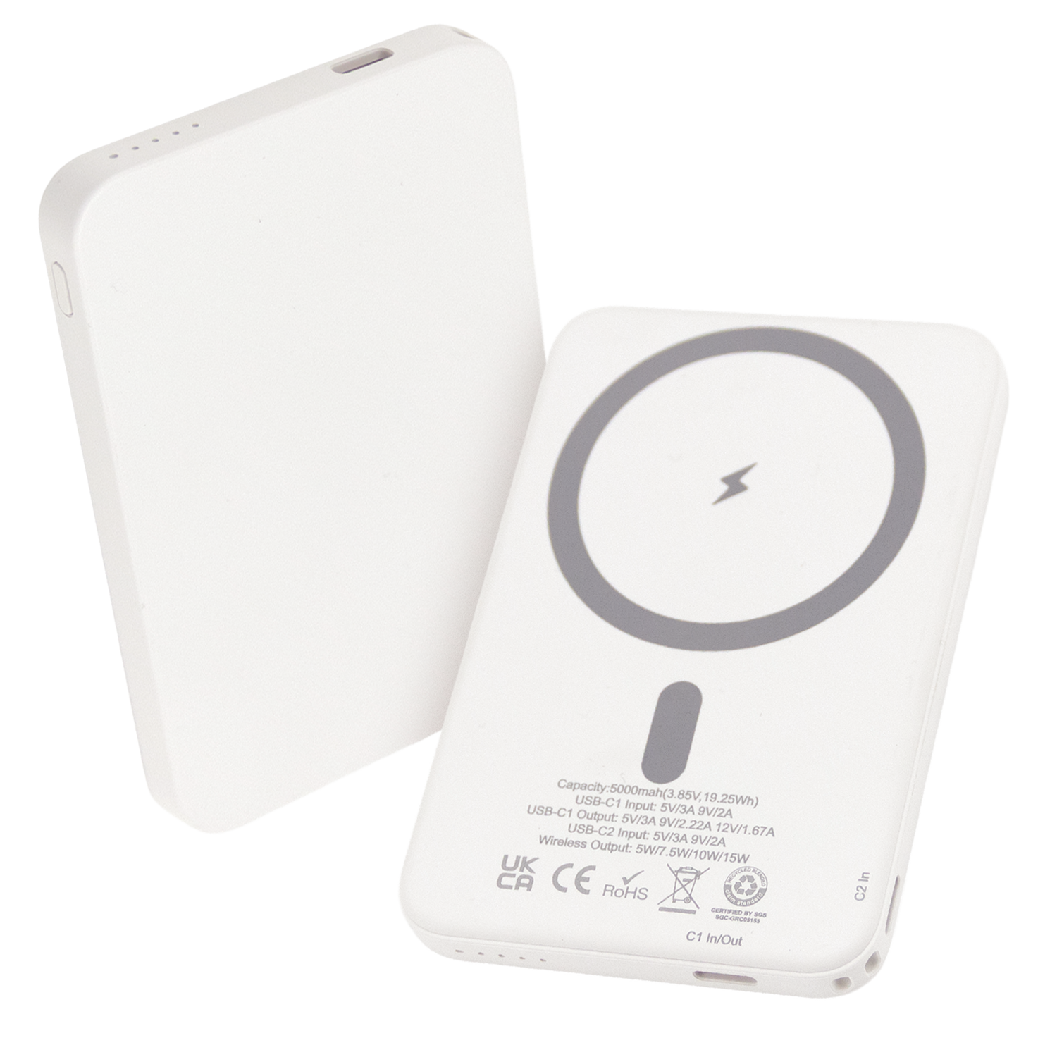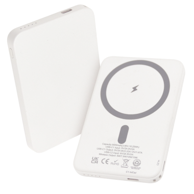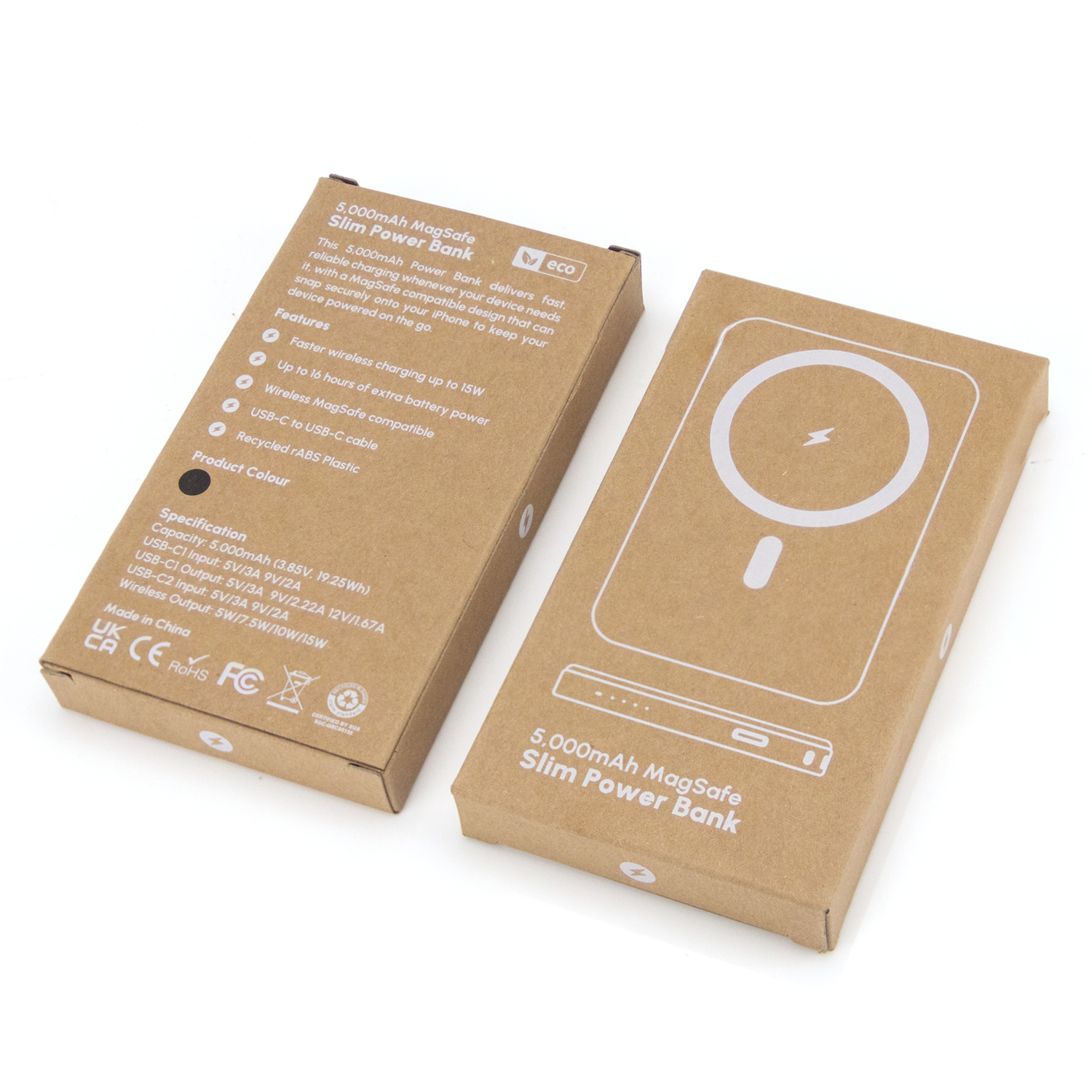 The 5,000mAh Power Bank delivers reliable everyday power with a MagSafe-compatible design that securely attaches to your phone for effortless charging. Offering up to 16 hours of extra battery life and fast 15W wireless charging, it also includes a Type-C cable for charging compatible devices when needed. Made from recycled materials, it combines performance with sustainability, while the smooth surface offers a very clear, full-colour, edge-to-edge branding area for maximum visual impact.