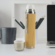 The perfect travel companion – whether you take it on your dog walk or on your commute, you can always rely on the flasks secure lid to prevent leaks and the unique top which needs to be pushed to allow your beverage to flow. With a real bamboo wrapped body, these flasks are perfect for engraving a brand logo, but also are suitable for 1-2 Spot colour branding.