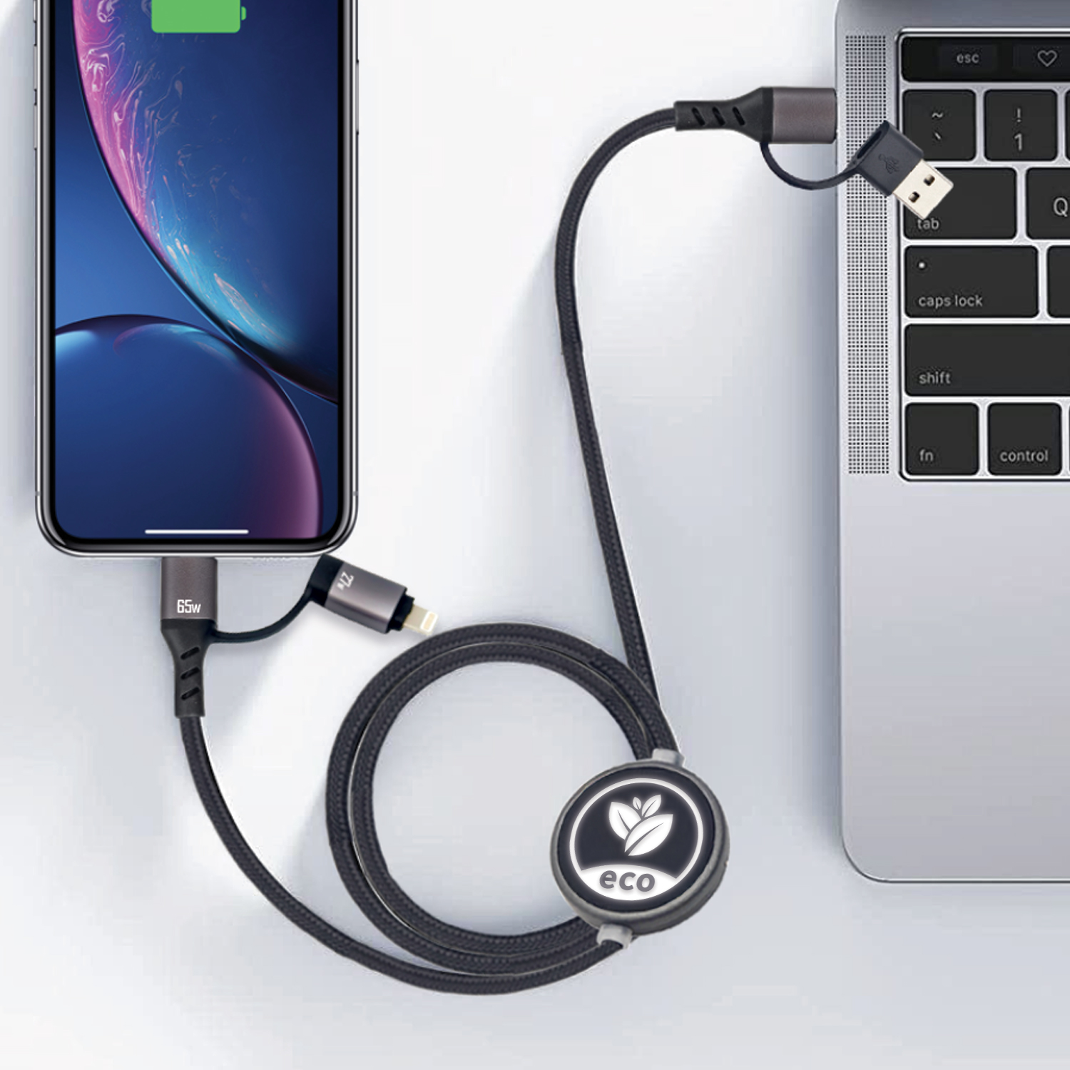 Designed for branding that stands out, this eco-friendly 1.2m charging cable combines 65W fast charging and secure data transfer with a sustainable build made from 91.21% recycled materials. Its full colour print or LED-engraved branding creates a premium illuminated branding effect, ideal for giveaways, events, or corporate merchandise. Add optional NFC technology to instantly link users to websites, campaigns, or digital profiles, turning every cable into a smart promotional tool.