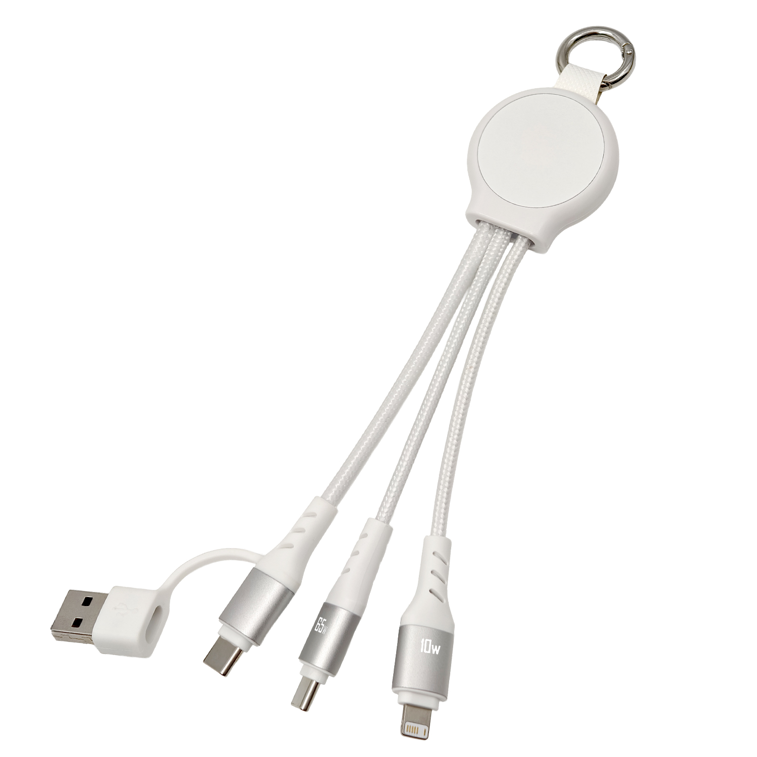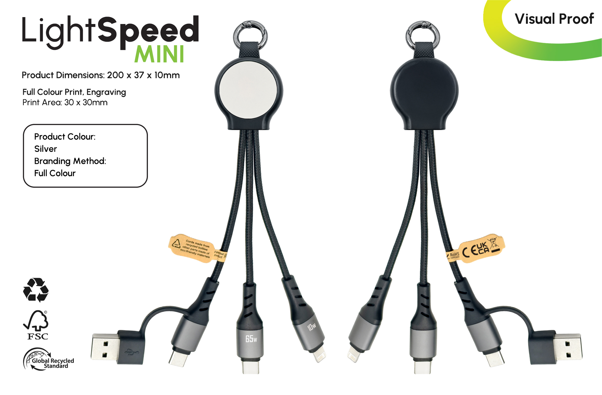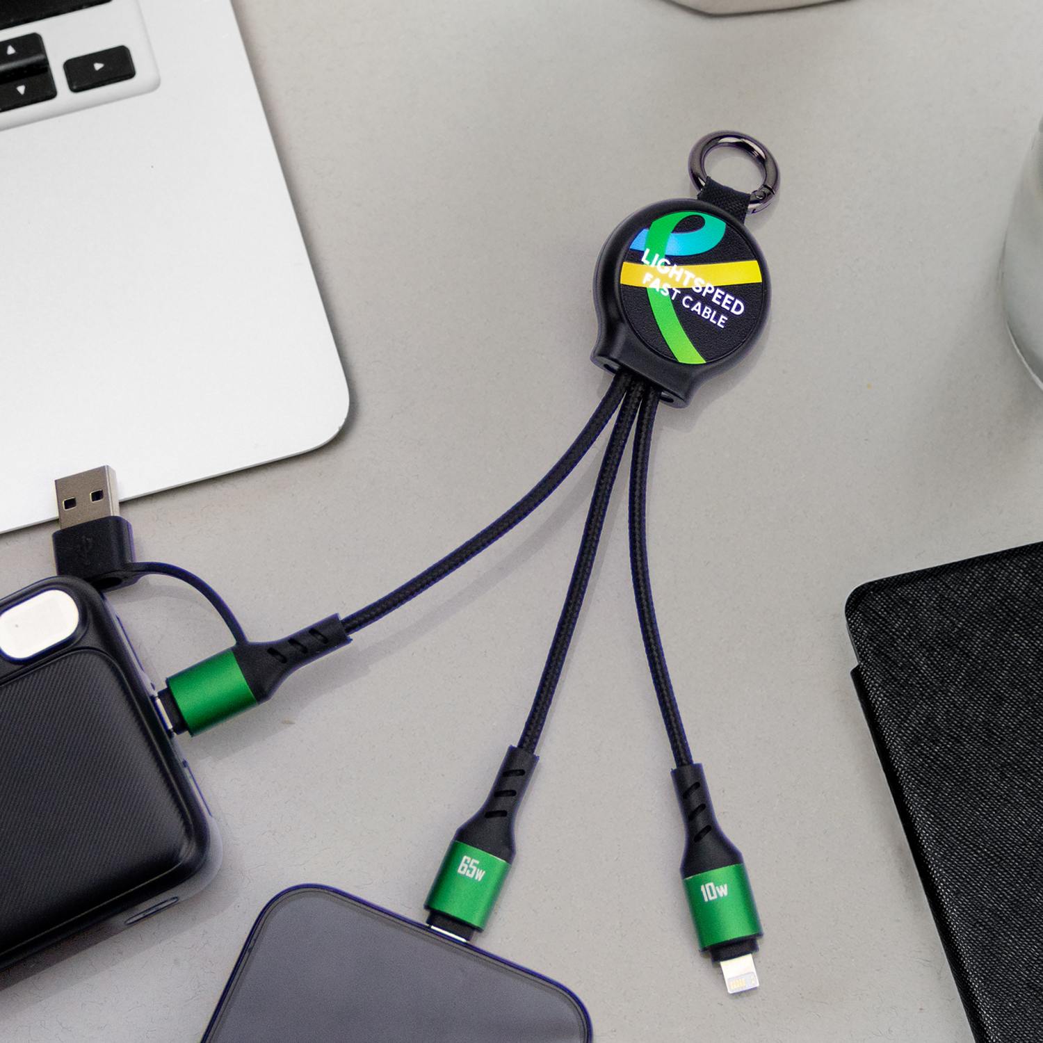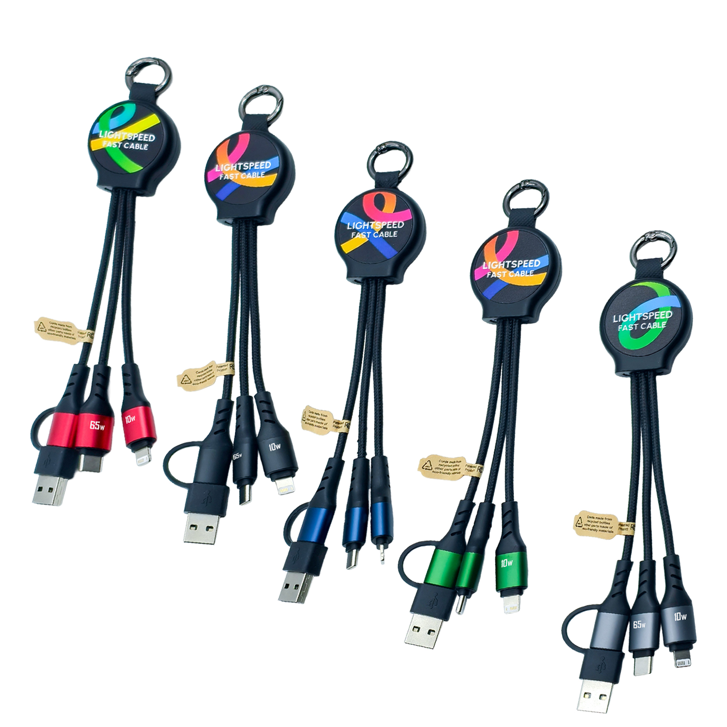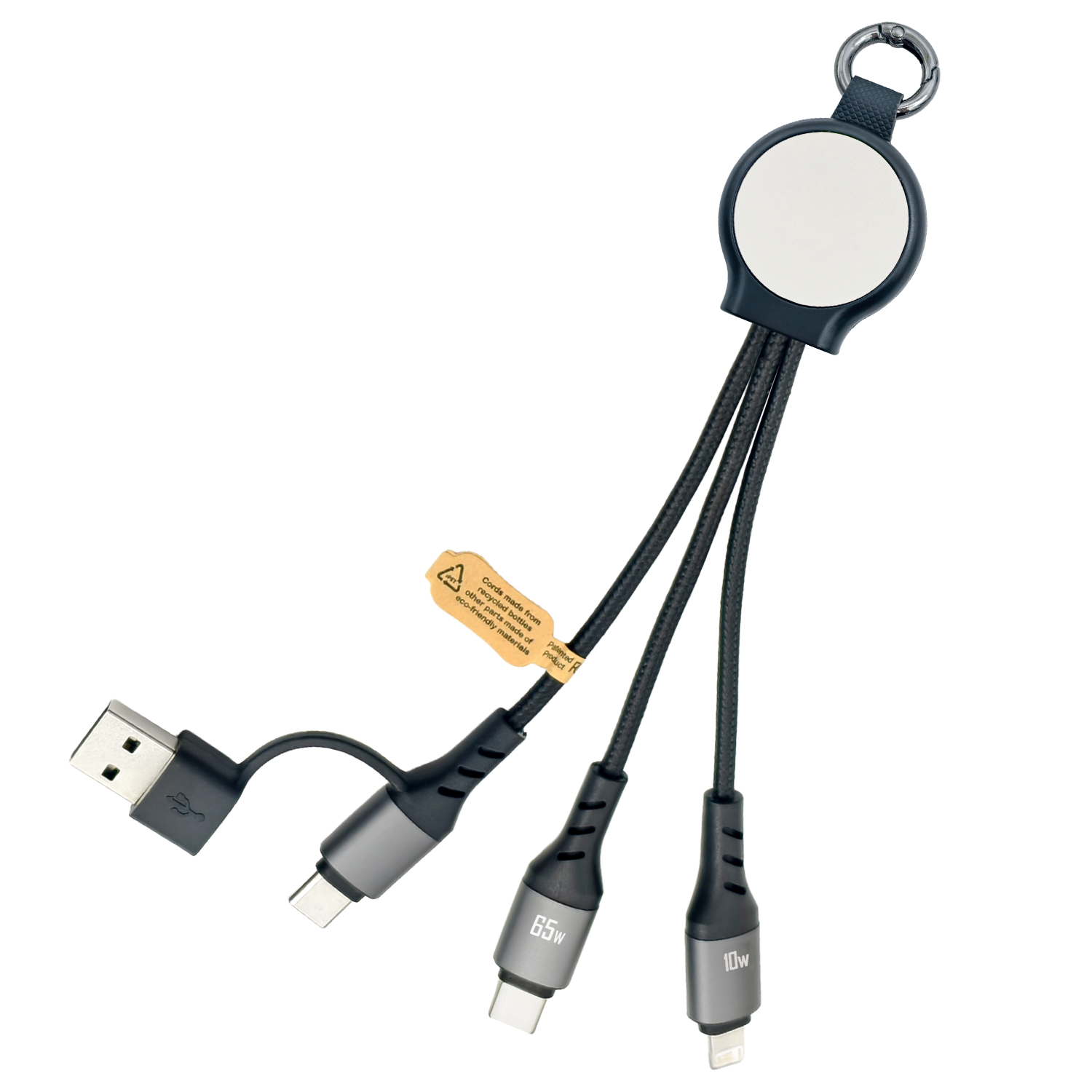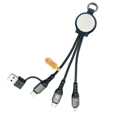 Designed for on-the-go charging, this compact 20cm multi-charging cable is ideal for everyday use. It features three integrated connectors, including a powerful 65W PD Type-C, a Lightning cable, and a dual-use Type-C cable with USB-A adapter, allowing easy charging and reliable data transfer across multiple devices. Made from 85.1% sustainable materials, it offers high-impact branding options with either full-colour print or an eye-catching LED glowing logo. Small enough to store in a pocket, laptop bag, or car console, this practical cable is ready for quick, hassle-free use whenever you need it.