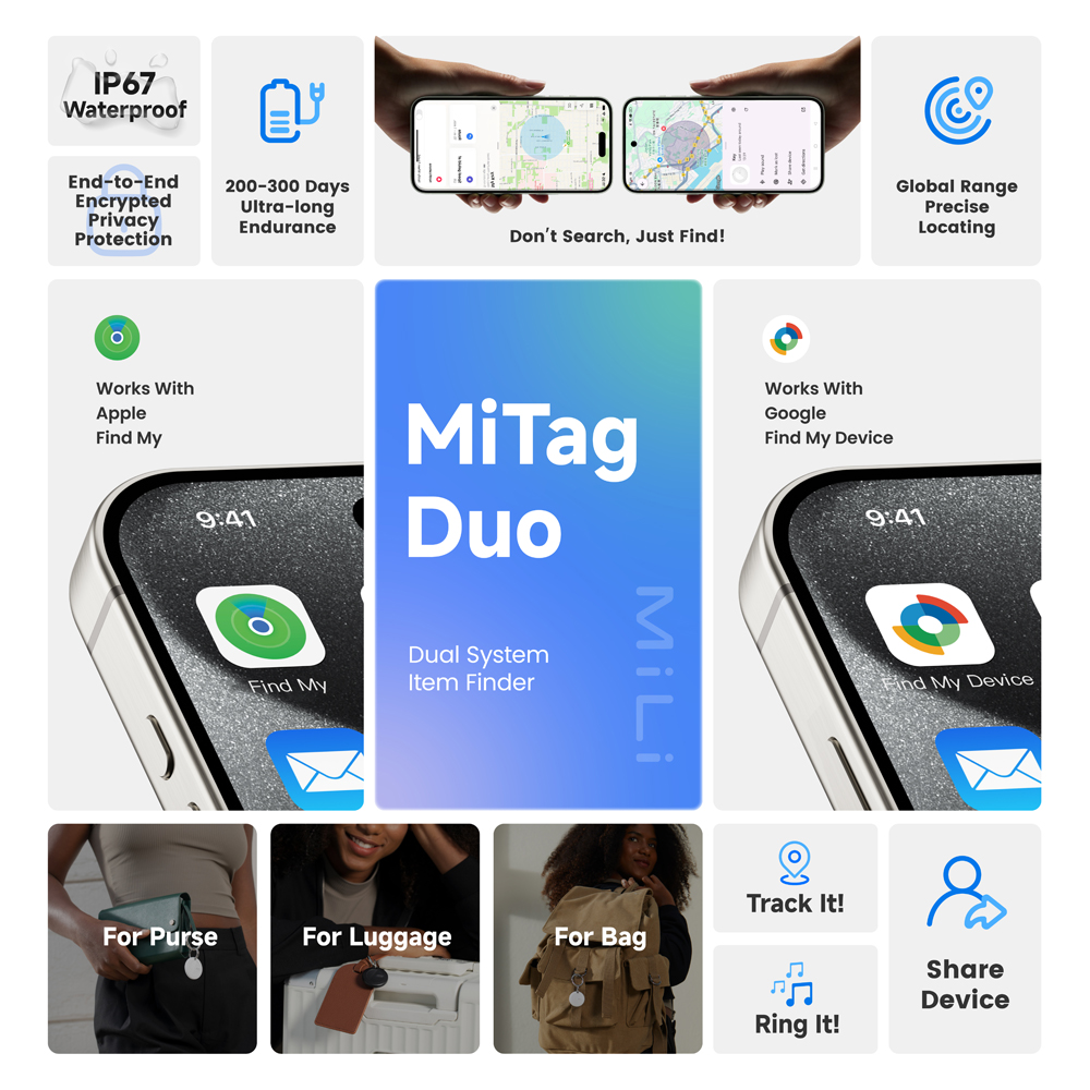 Introducing MiTag Duo, the World’s First AirTag alternative that works seamlessly with both iOS and Android devices—all in one compact, powerful tracker.