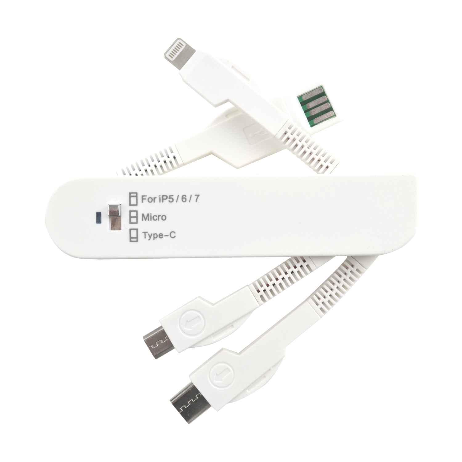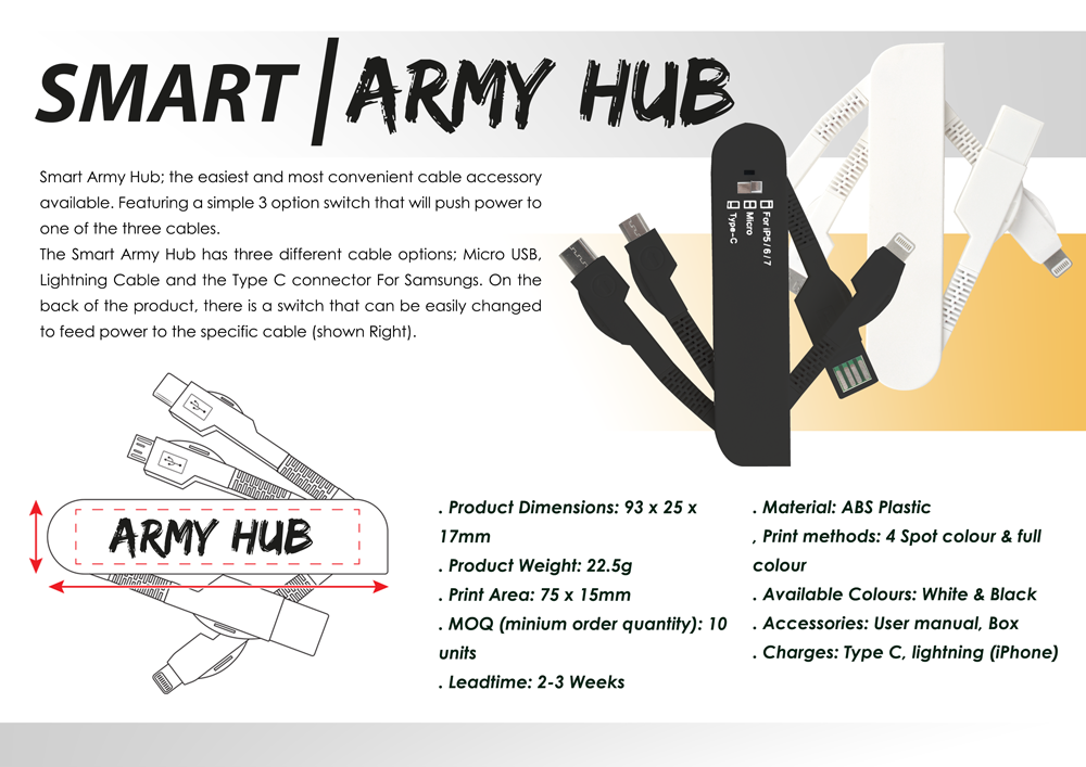 The Smart Army Hub has three different cable options; Micro USB, Lightning Cable and Type-C. On the back of the product, there is a switch that can be easily changed to feed power to the specific cable.