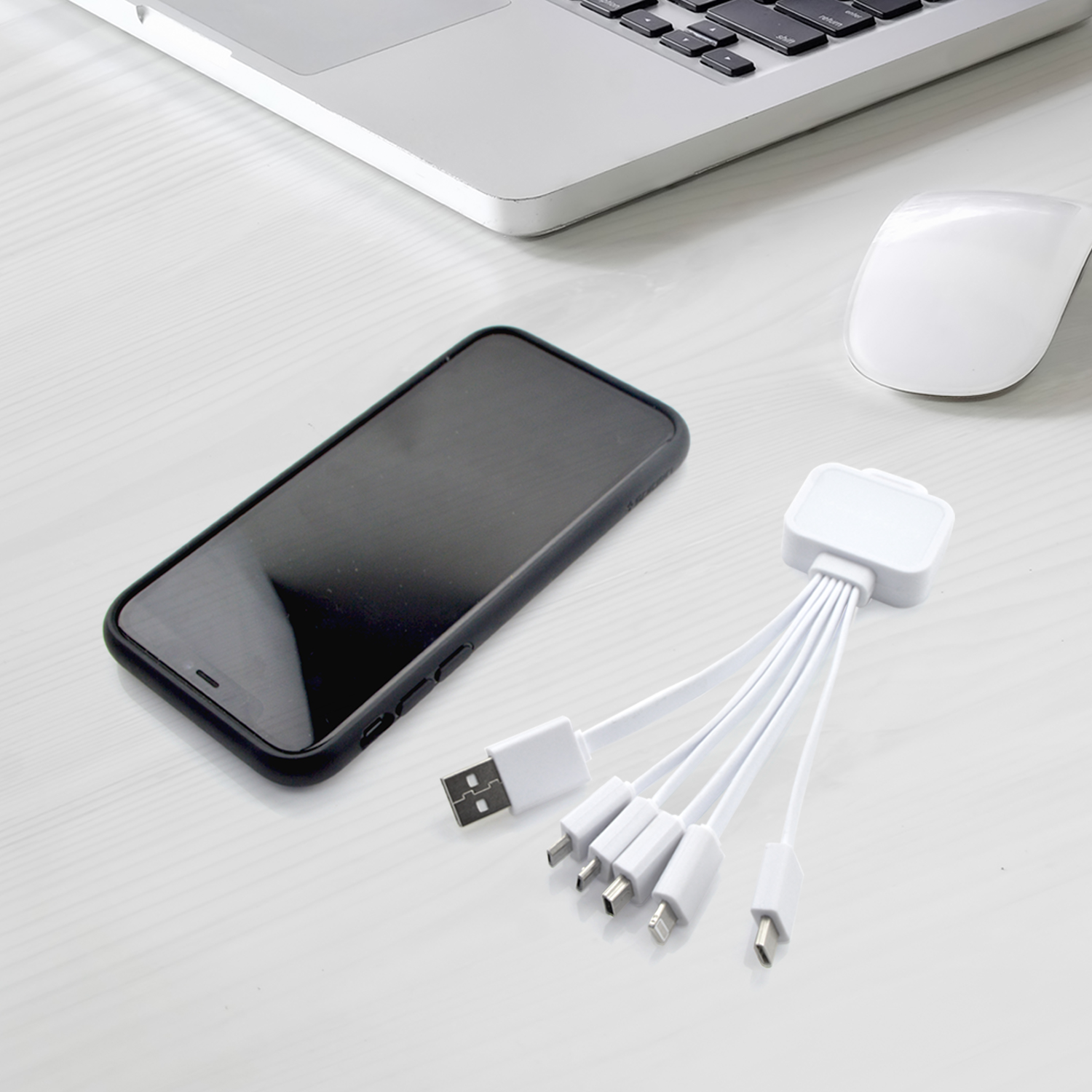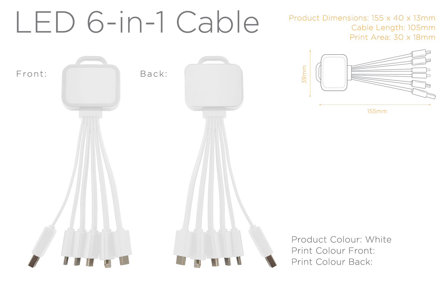 The LED 6-in-1 multi-cable is the next step to making your brand glow! Featuring 5 cables, you will be able to charge a wide range of devices, with support for Type-C, Lightning, Mini-USB and Micro-USB devices. The LED 6-in-1 cable will light up when connected to power, bringing your brand to life! The cable is suitable for charging; iPhone, Android, Cameras and Tablets, and also features two micro-USB connectors for device to device connectivity.