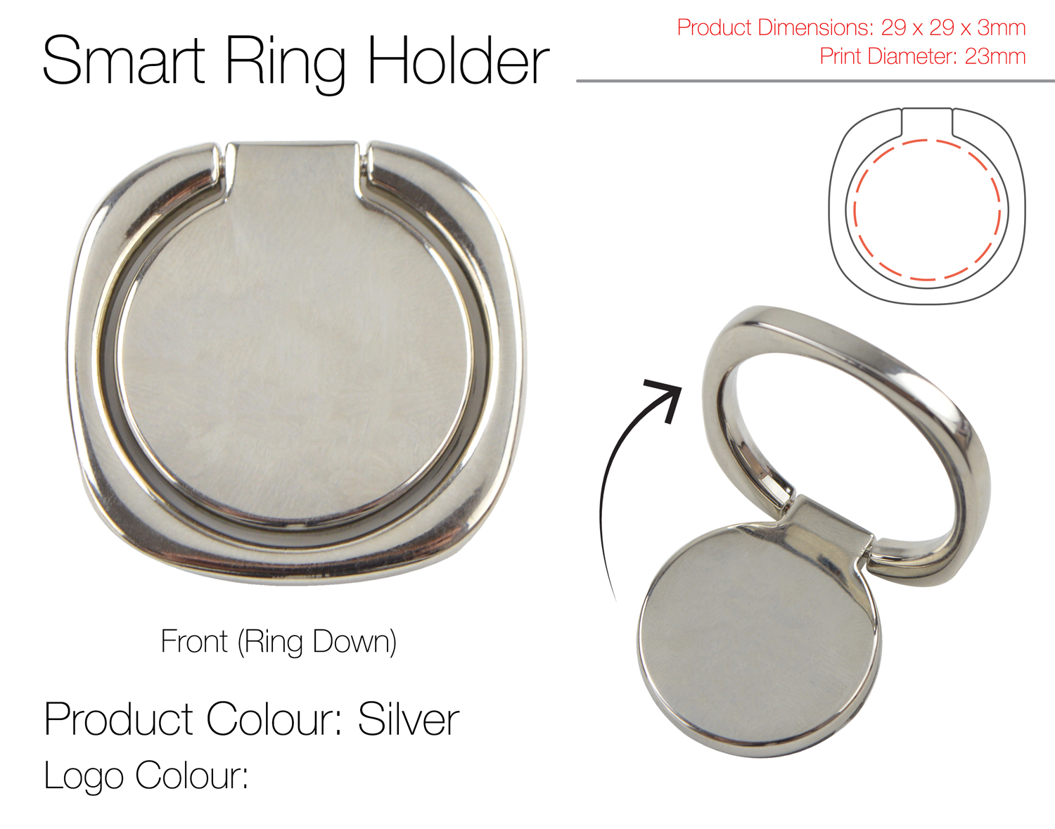 Once the Ring Holder is stuck to your device, take advantage of its 360° rotation and 180° angled stand immediately! Laser engrave or print 2 colours onto the foundation of the Ring Holder to show off your professional and sleek product. The handy Ring Holder can be fitted onto any smartphone no matter what make or model, making this the perfect accessory to keep your device secure in your hand!