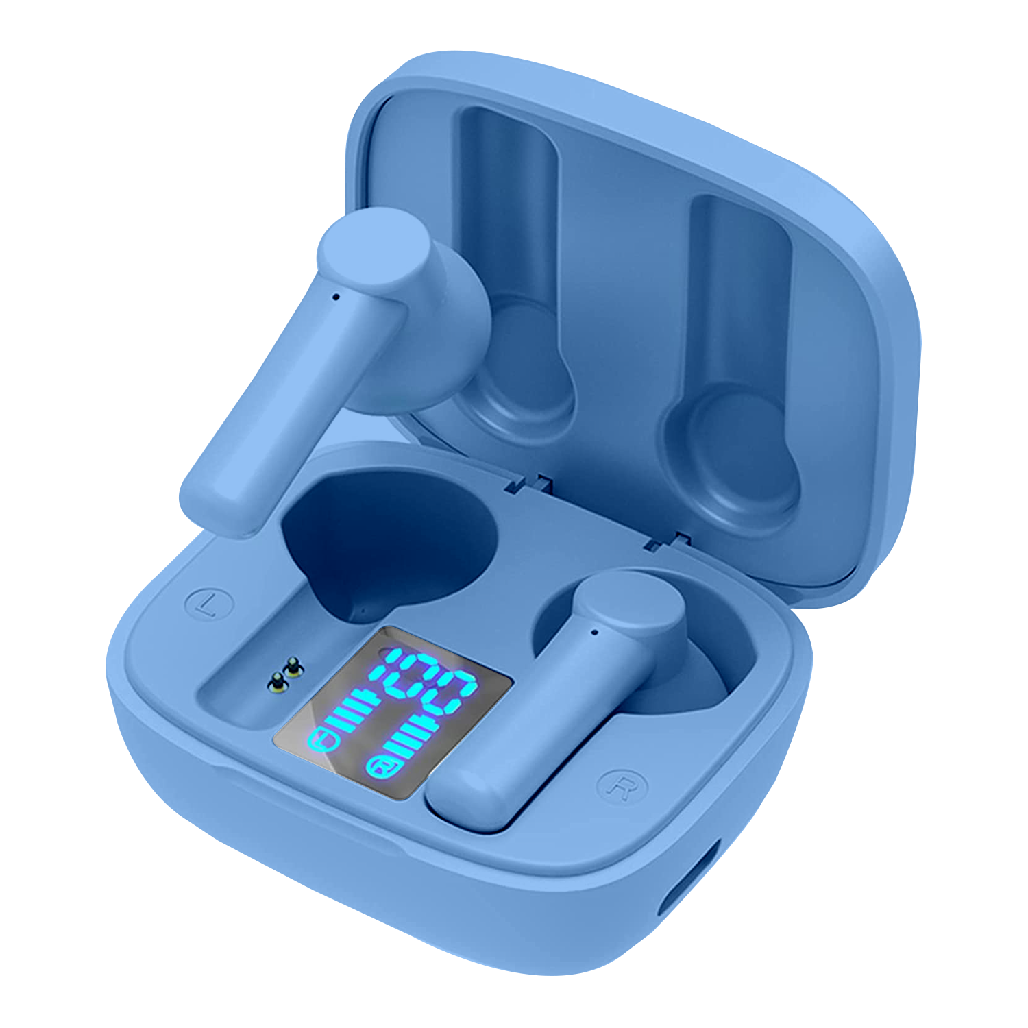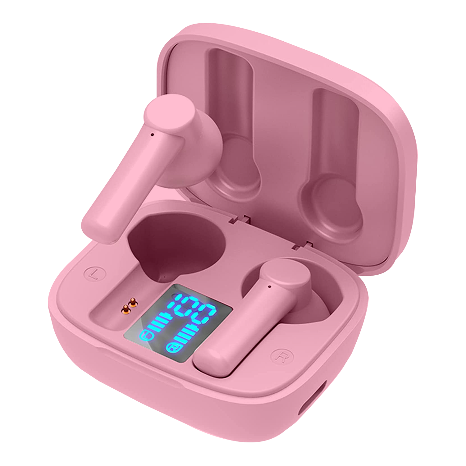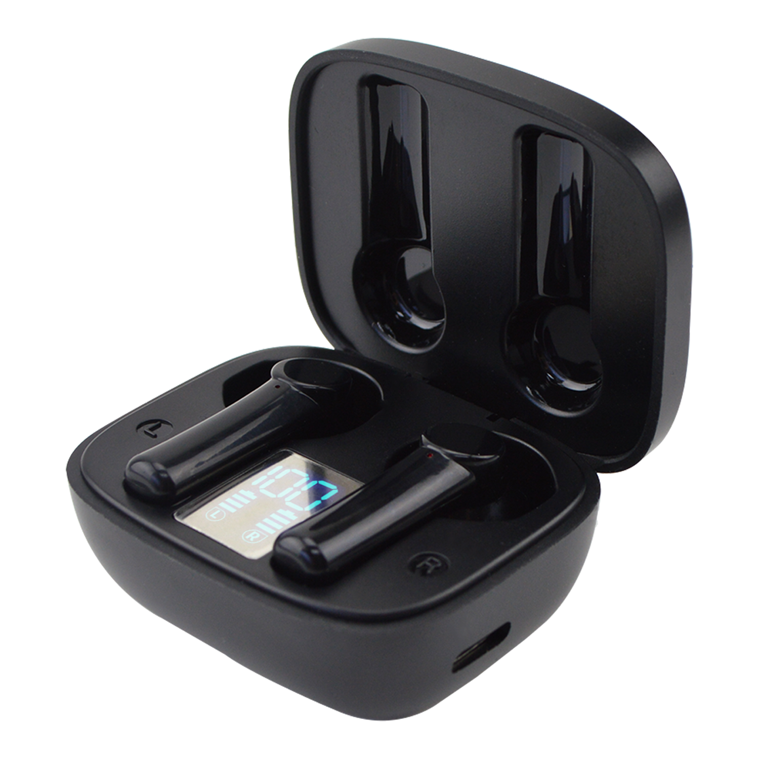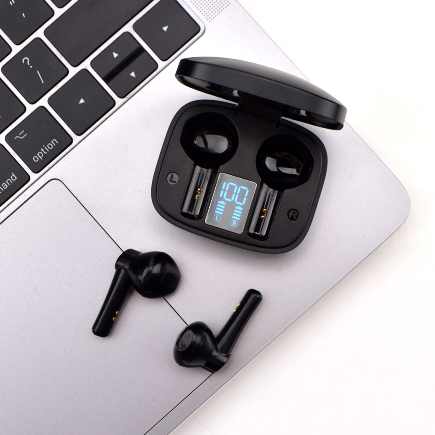 • Digital display shows power levels for the case and individual earbuds
