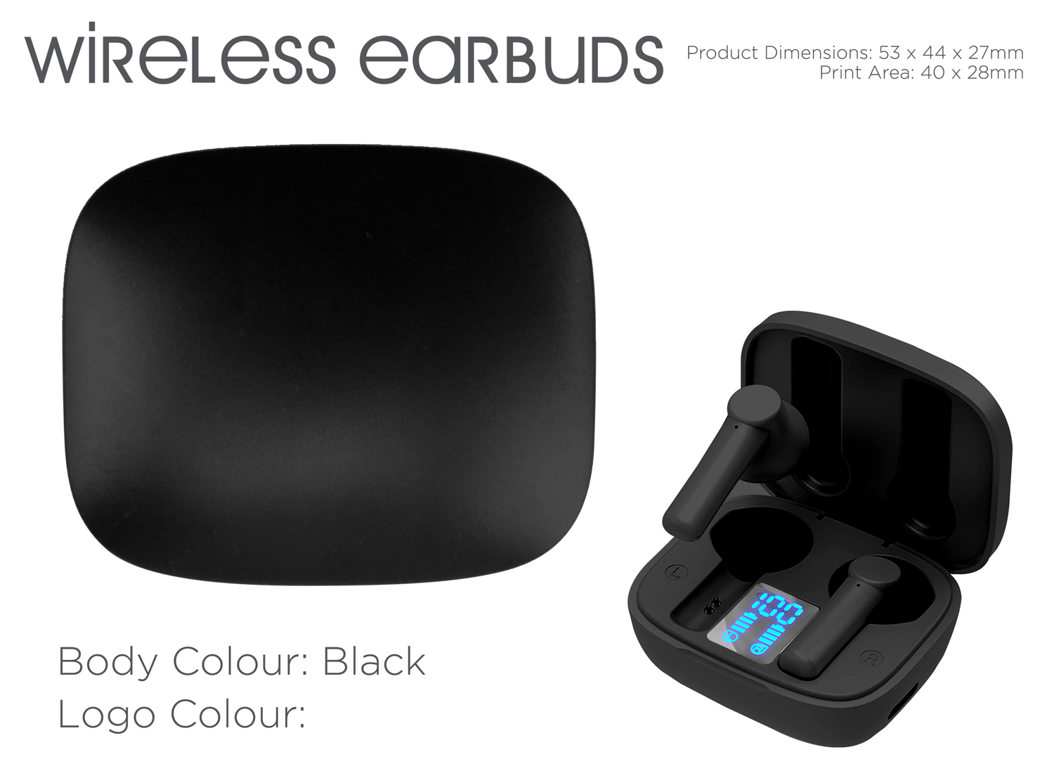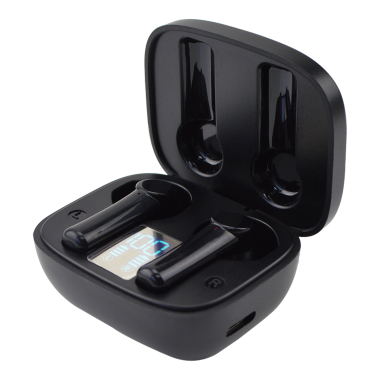 The Wireless Earbuds bring you all the luxuries of traditional earphones, just without the struggle and mess of tangled cables. Enjoy your favourite music or talk hands-free for up to 4 hours. When your Earbuds are low on battery, simply place them back into the 300mAh charging case and monitor the battery levels using the digital display inside the case. With a Bluetooth range of around 10 metres, these mini bluetooth earphones can be easily branded on the case, creating a unique and high-quality gift.